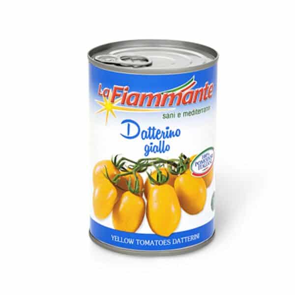 Deliziosi pomodorini datterini gialli 100% italiani, rigorosamente non OGM, conservati al naturale in latta, caratterizzati da una particolare dolcezza e da un alto contenuto di antiossidanti.